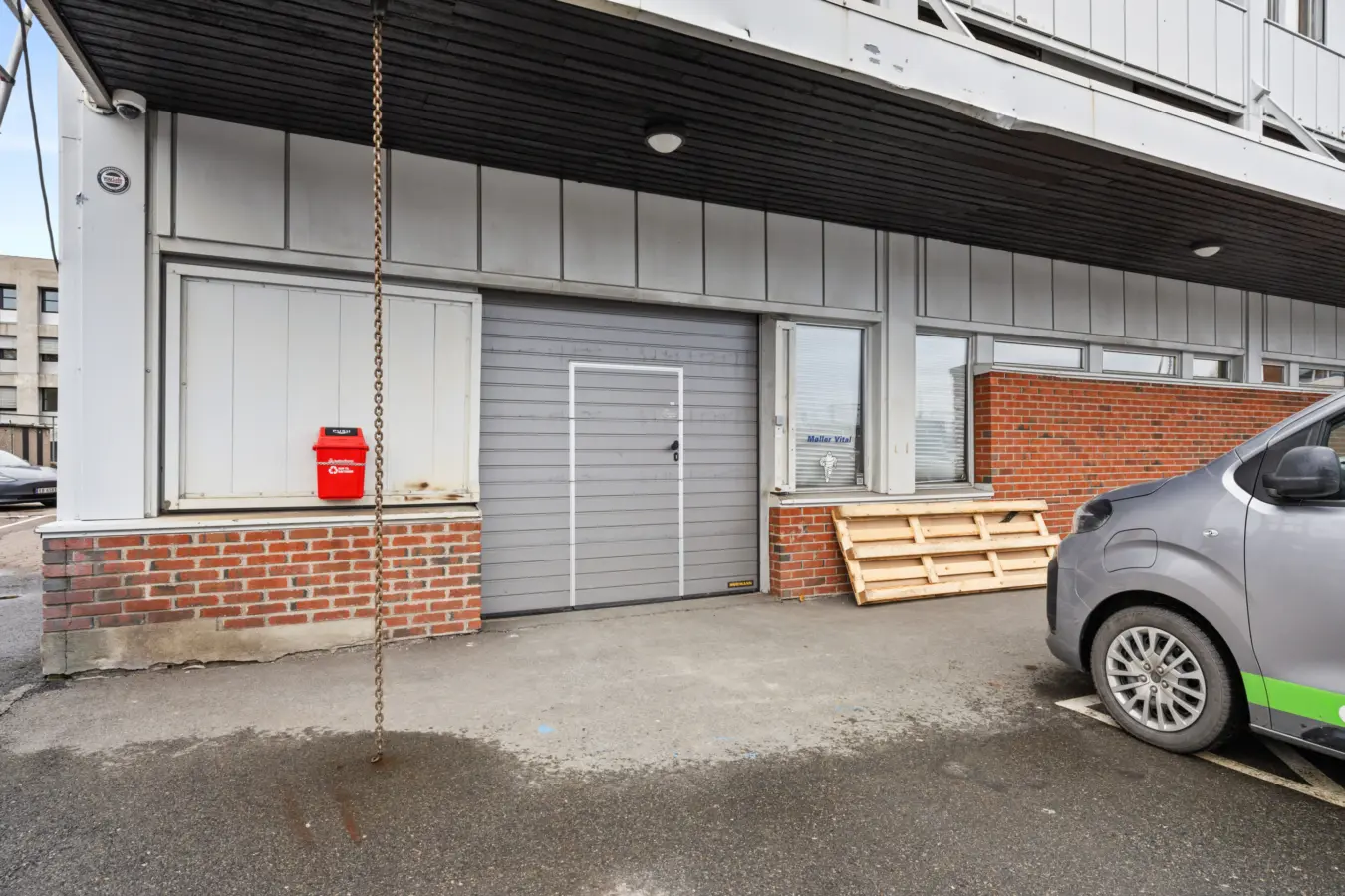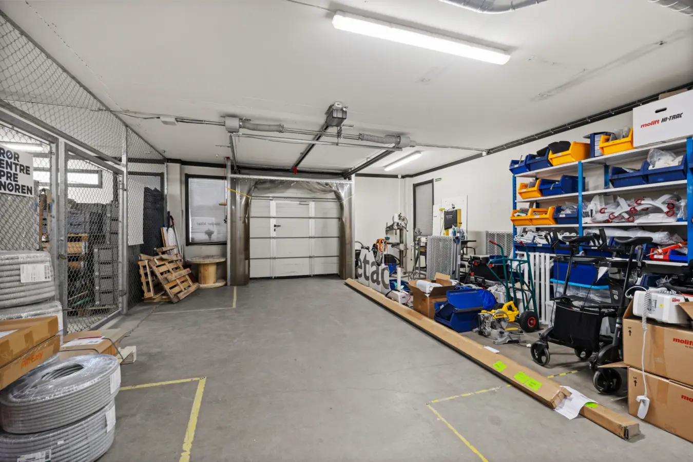 Direkte adgang til lager fra baksiden av bygget via. garasjeport.