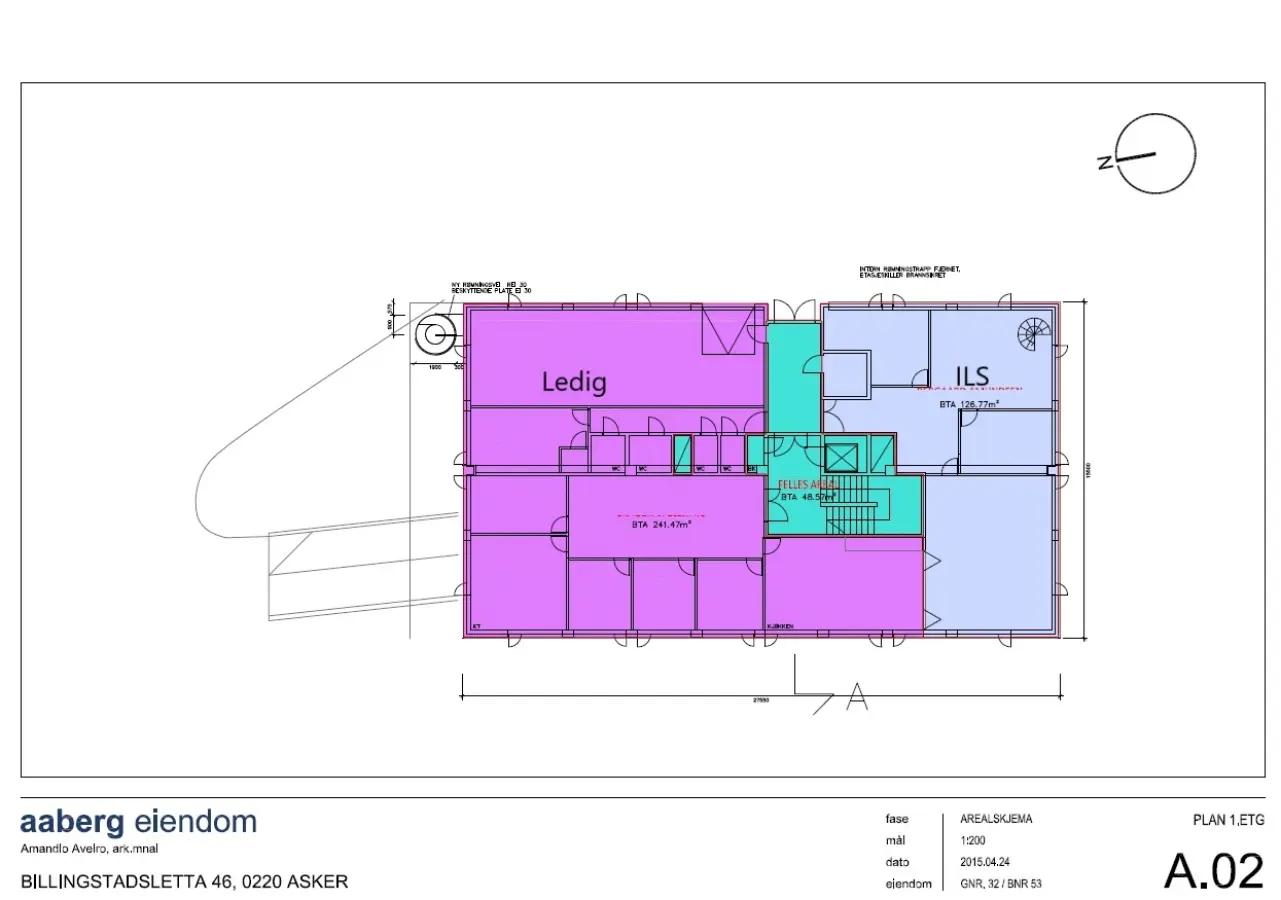 1 etg. BTA 417 kvm.: Inneholder kontorlokaler, showroom og lager med port fra baksiden av bygget. BTA 127 kvm. er utleid, resterende er ledig.