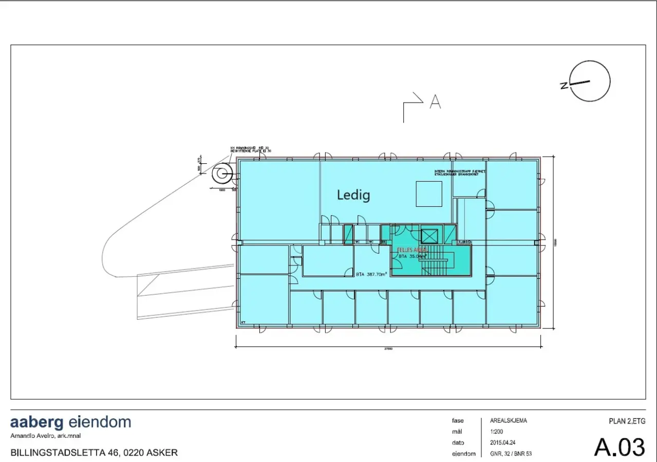 2. etg. BTA 423 kvm. Inneholder kontorlokaler. Etasjen er ledig.