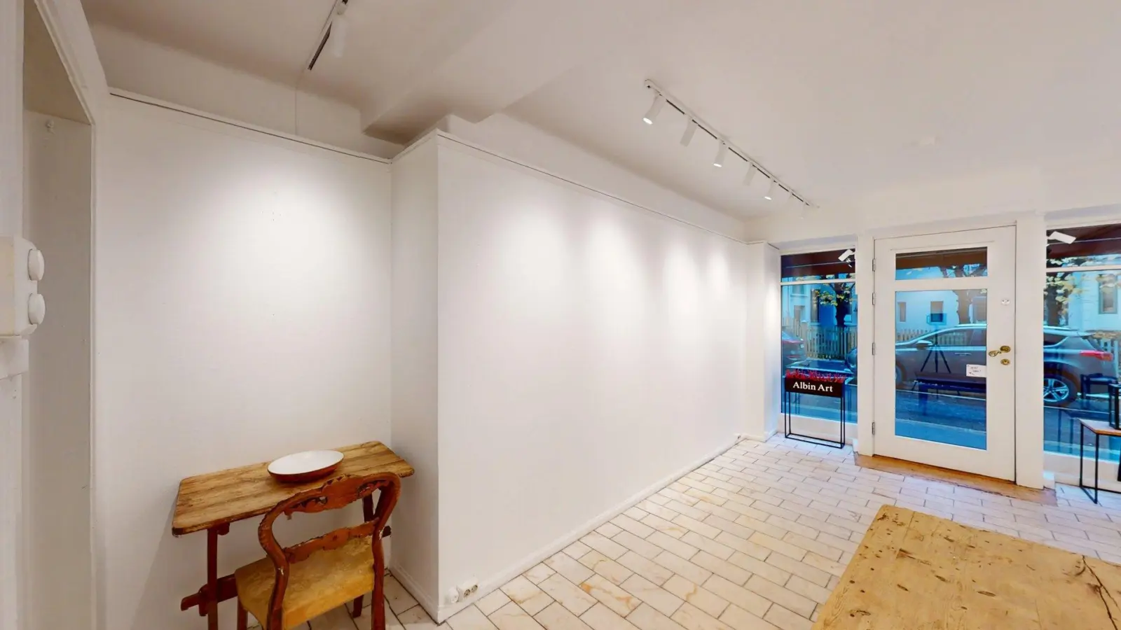 Lokale 1, BTA 85 kvm.: Lyst lokale med store vindusflater mot gaten. Lokalet har egen inngang fra gaten, men kan i tillegg åpnes mot felles inngangsparti med Kafe Albin. Lokale inneholder et stort forretning/utstillingslokale (oppdelt i to rom), toalett, samt kontor med enkelt kjøkken. Det er flislagt gulv, malte hvite vegger og himling med belysning i skinner.