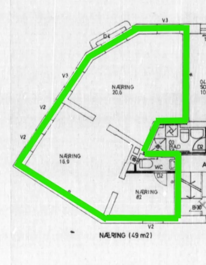 Showroom/landskap, 2 stk. møterom/kontor og toalett.