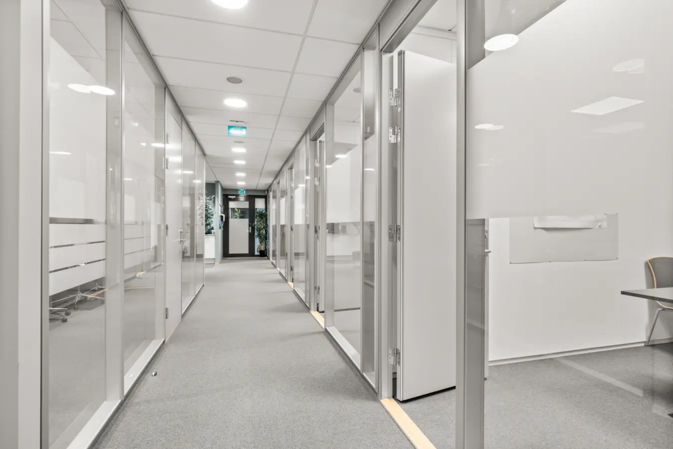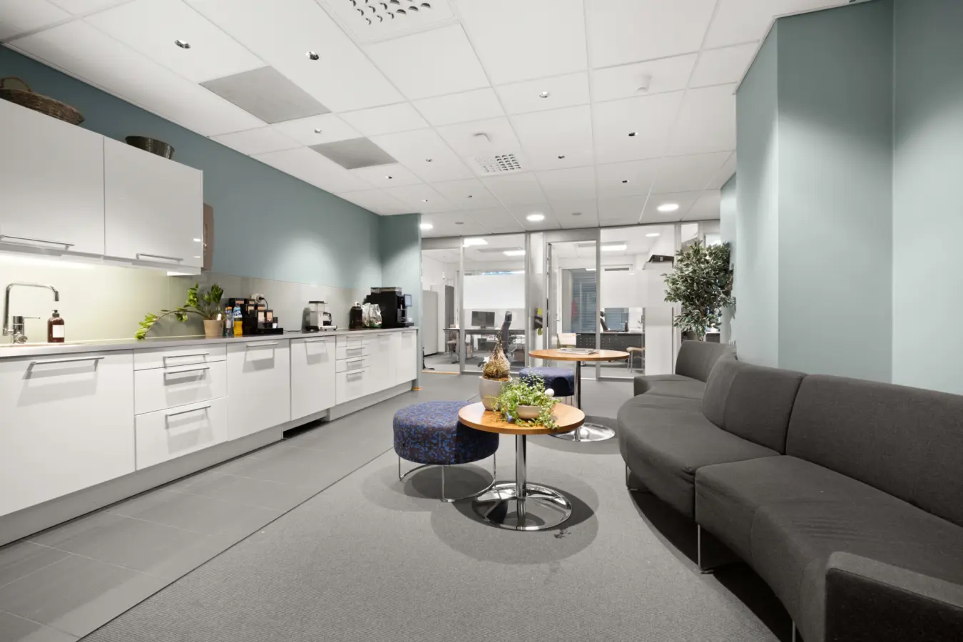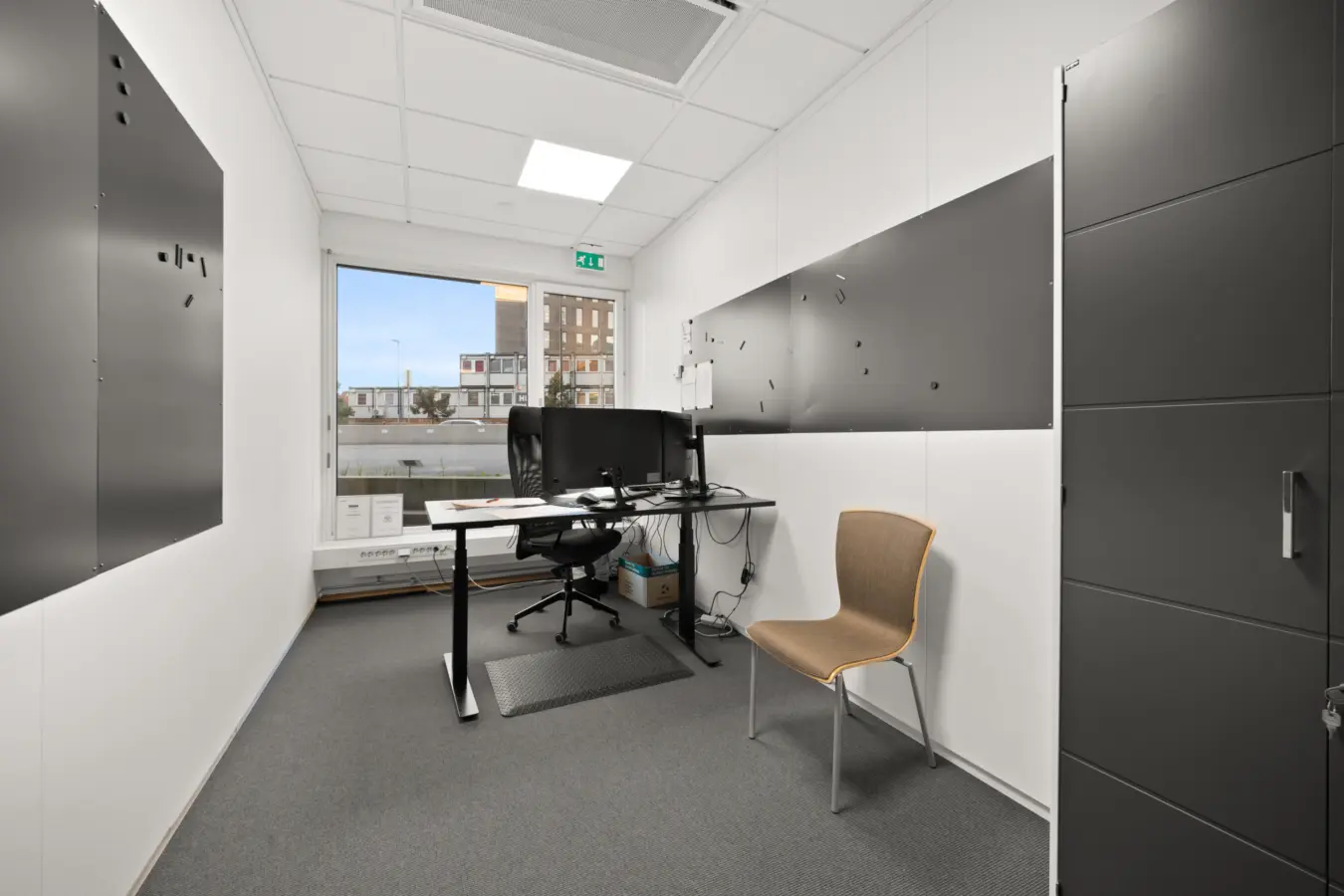 Moderne kontorlokale bestående av cellekontorer, romslig møterom, teknisk rom og sosialsone med kjøkken.