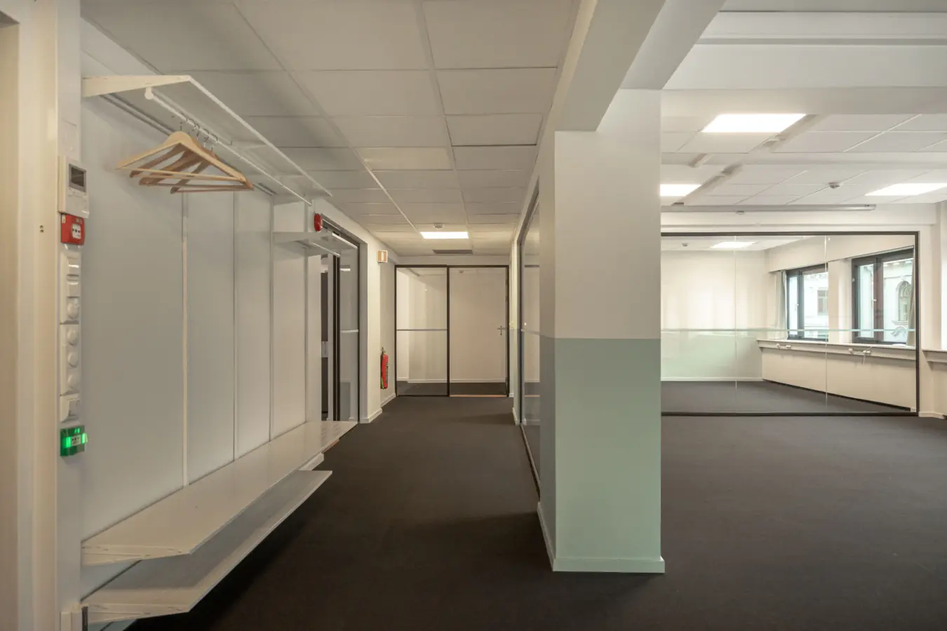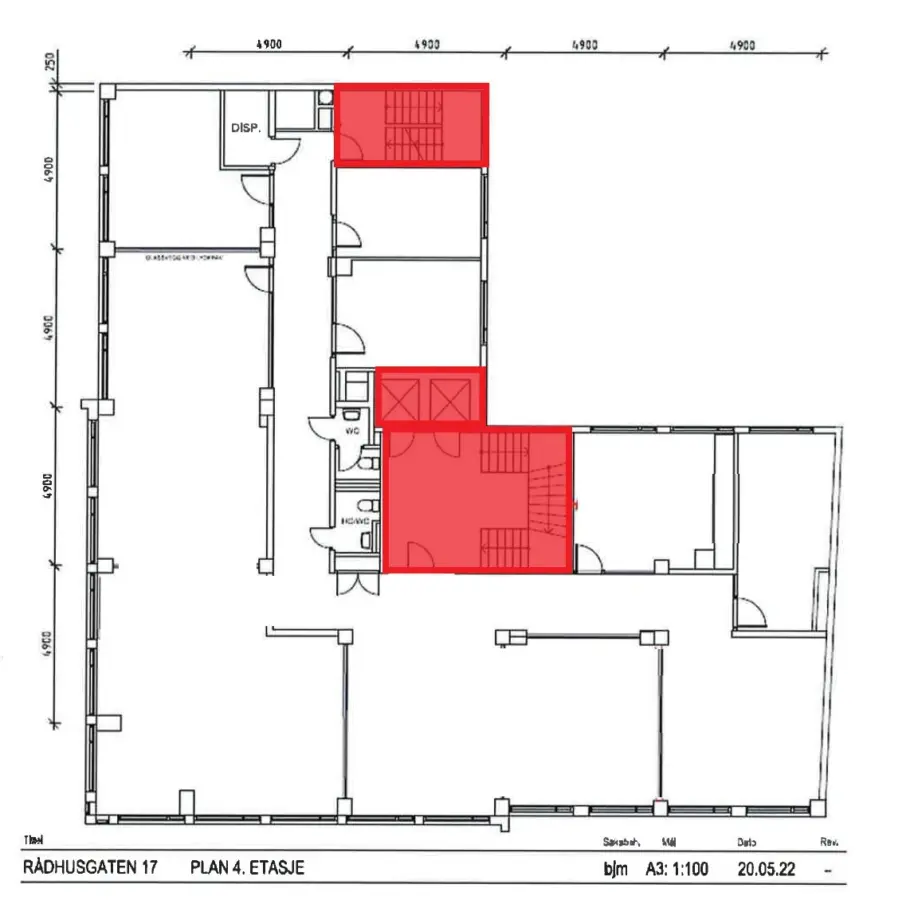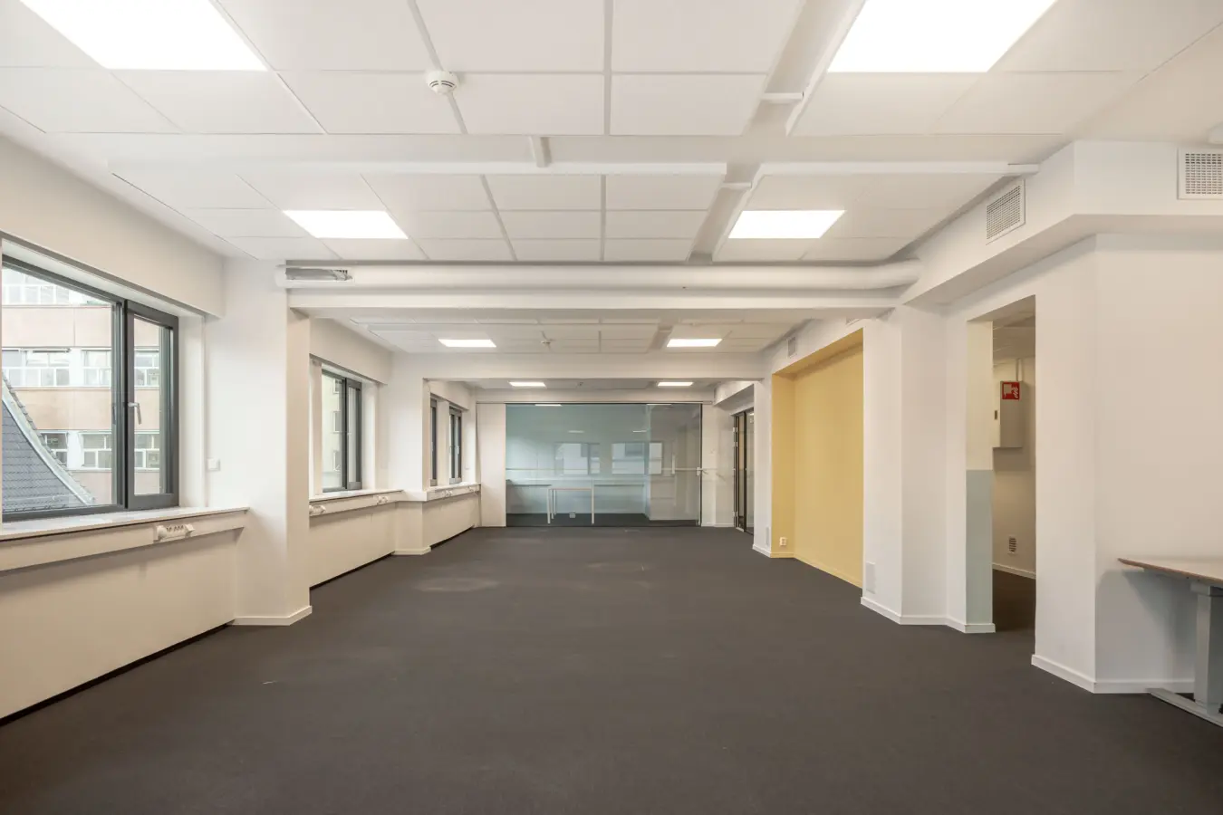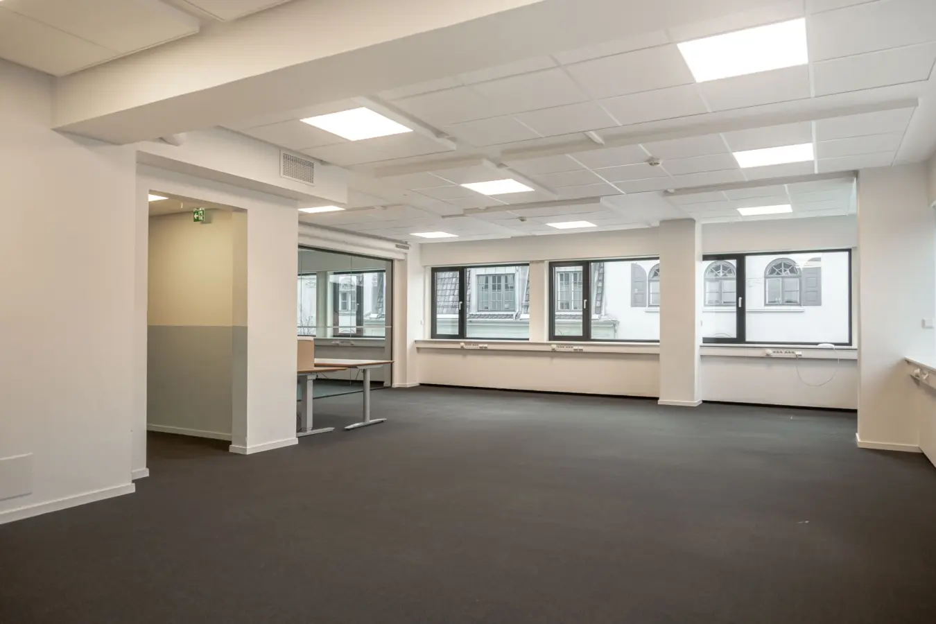 Fleksibelt kontorlandskap, cellekontorer, møterom, moderne kjøkken med spiseplass, toaletter, mm.