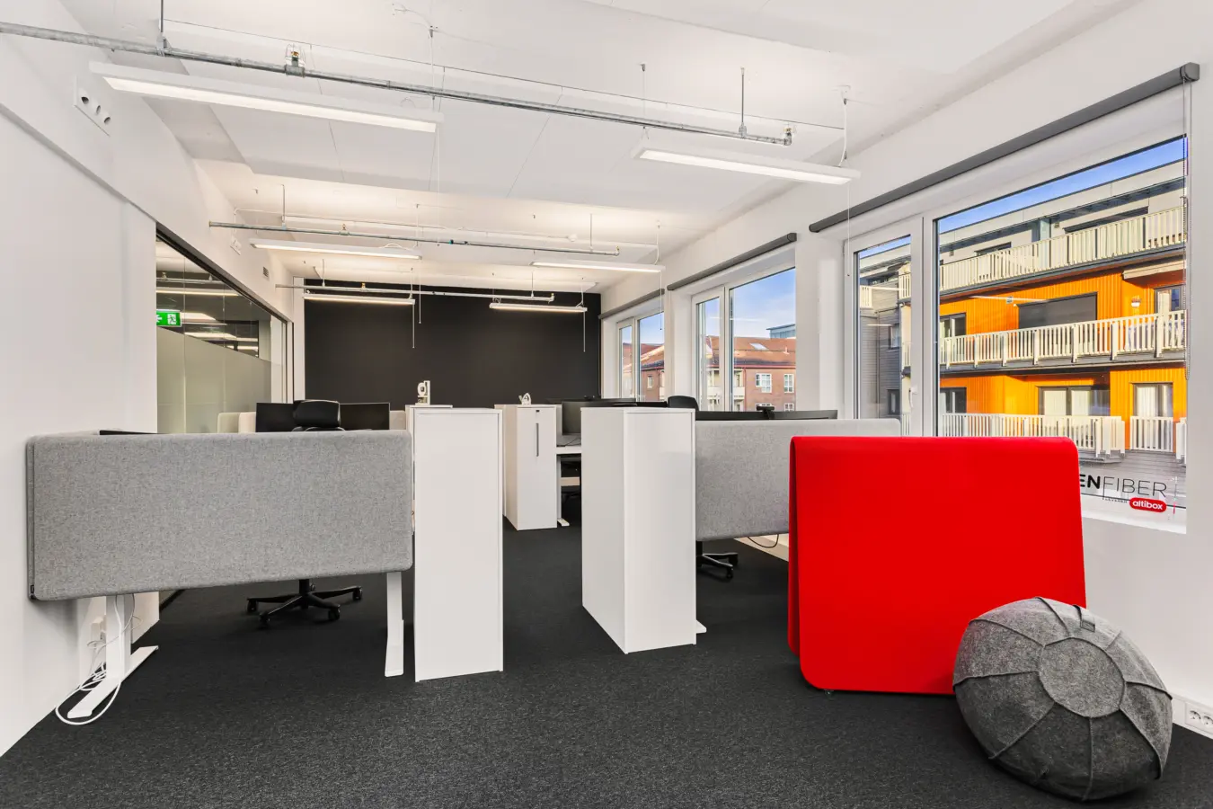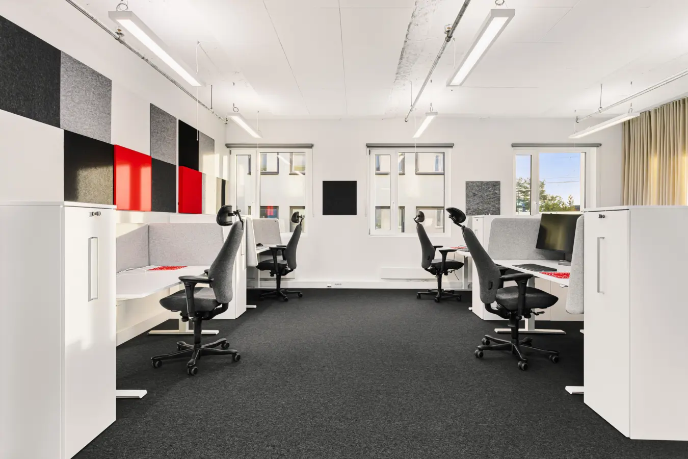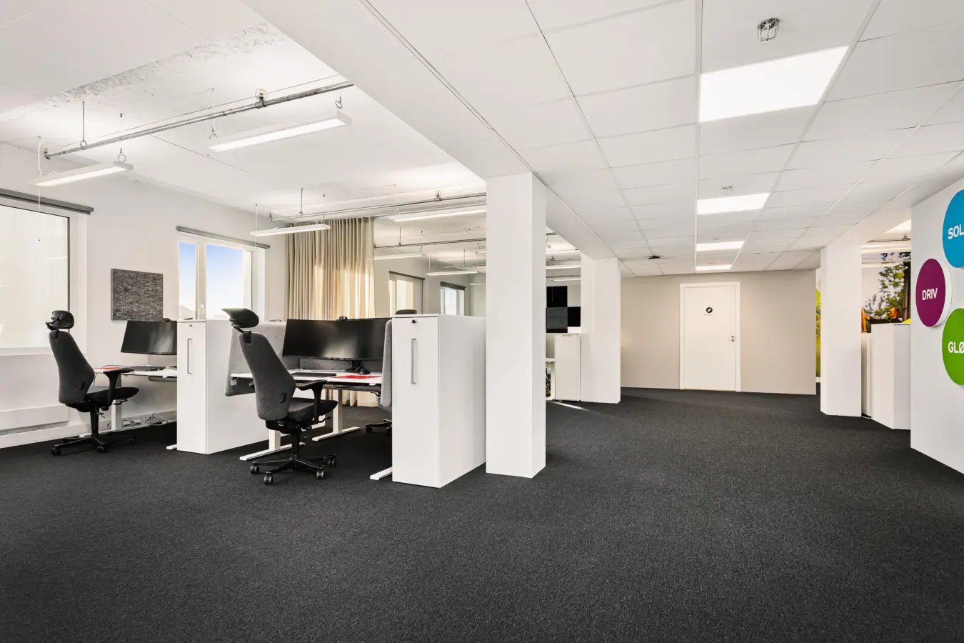 Lokalet har i dag en fin kombinasjon av kontorlandskap og cellekontorer, hvor det enkelt kan opprettes flere kontorer, eller åpnes ytterligere.