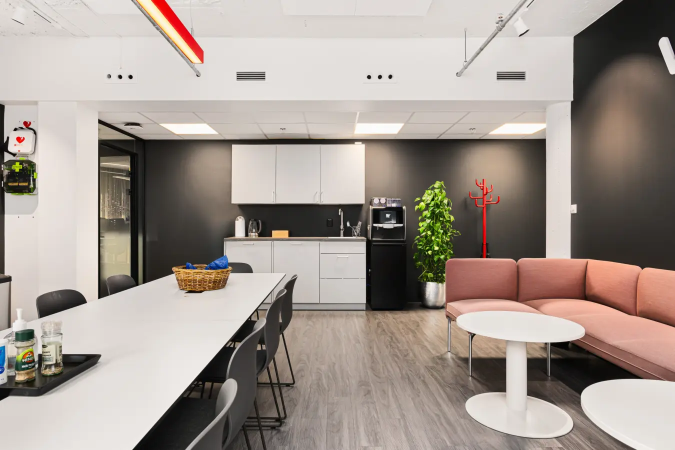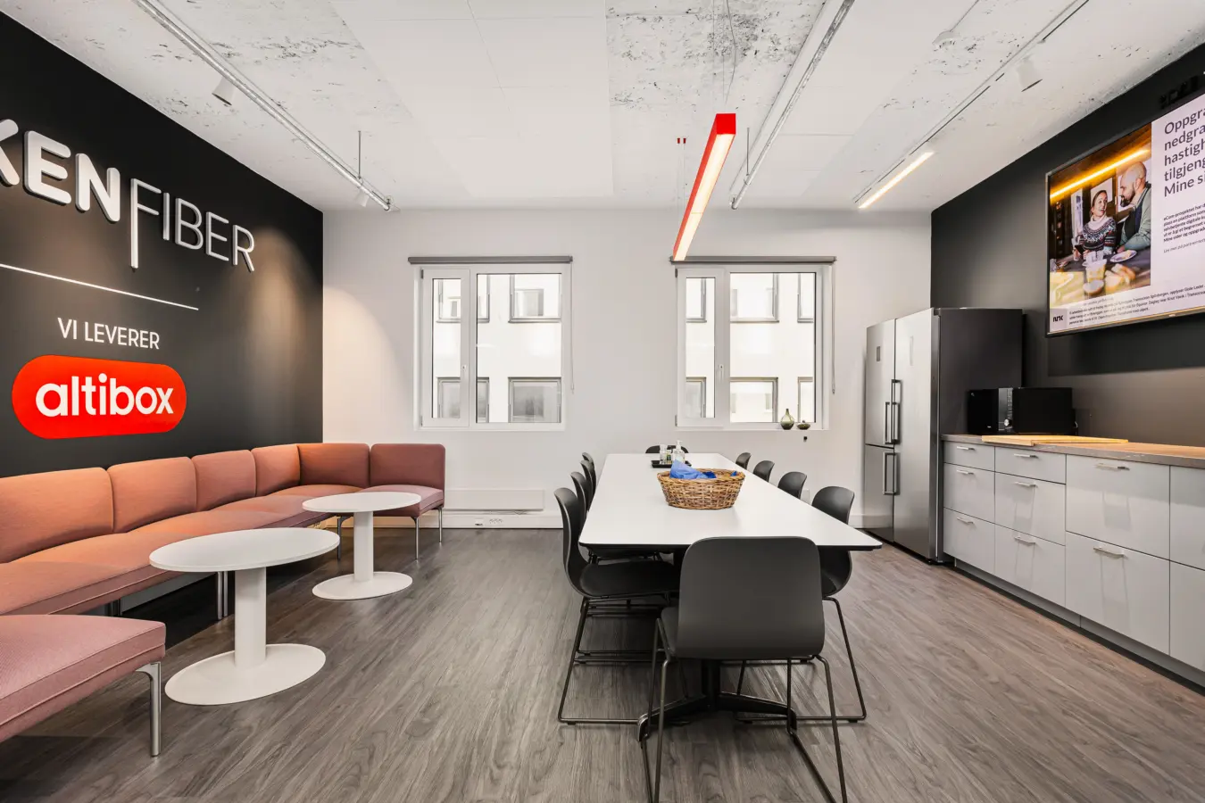 Kontorlandskap, cellekontorer, møterom, lounge-område med kjøkken og print-/tekniskkrom.