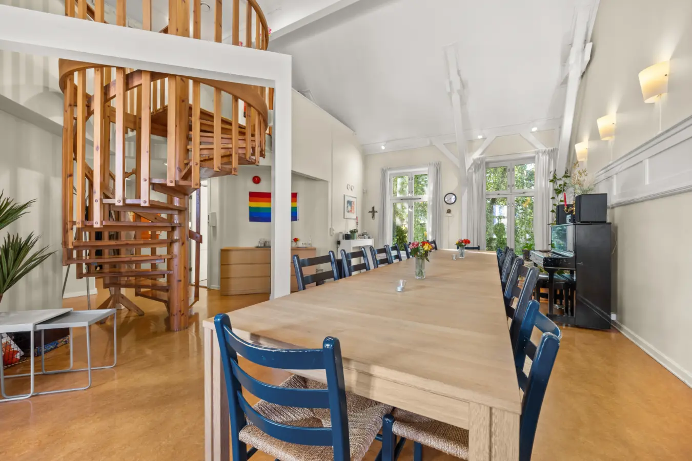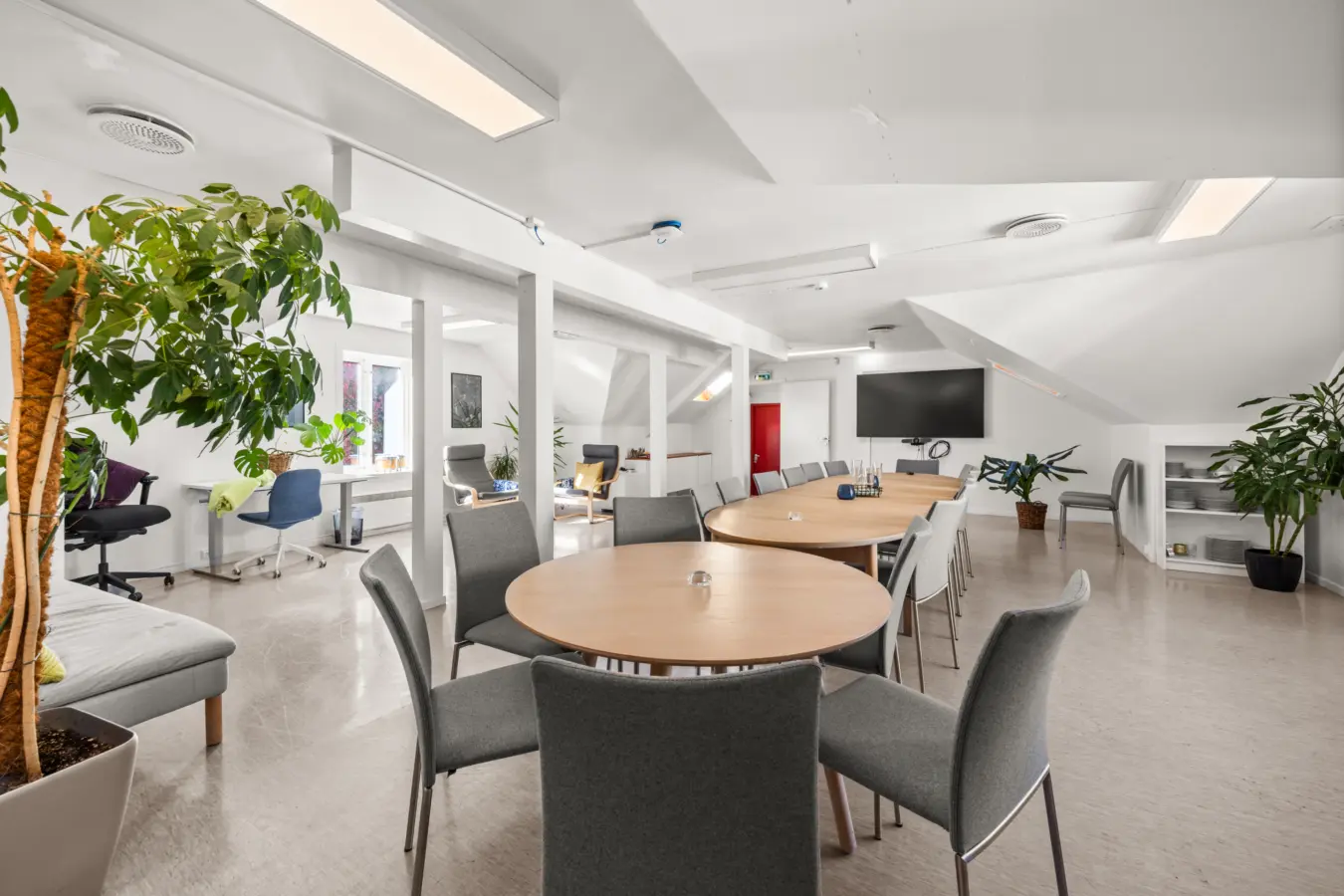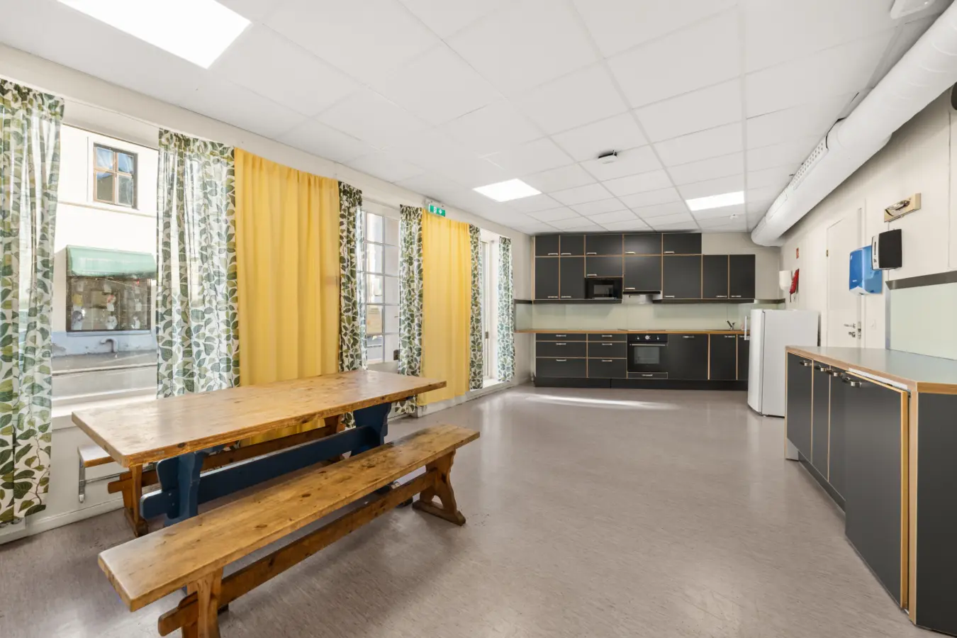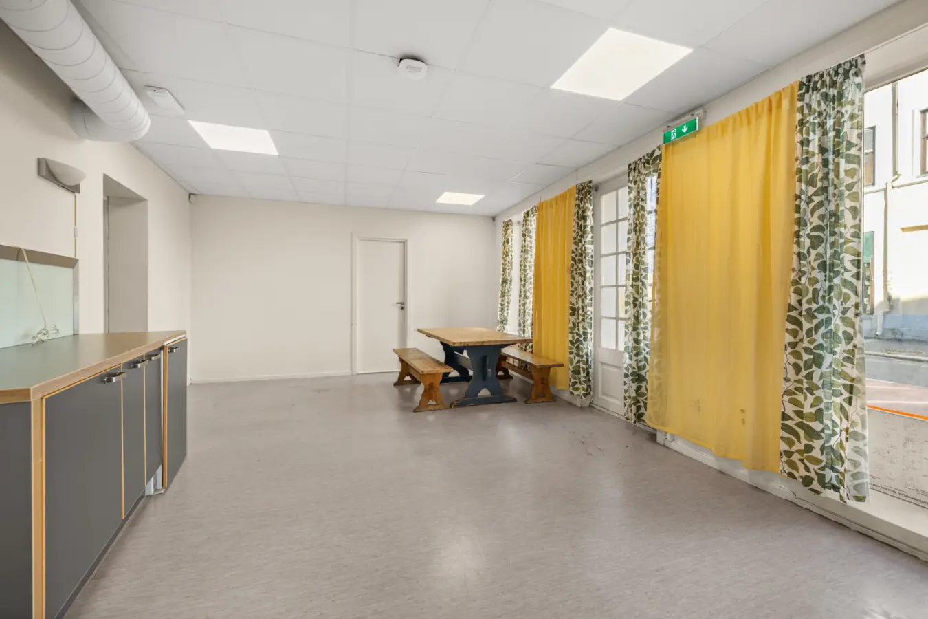 2.etg. Nr. 45: Stort allrom/forsamlingssal med god takhøyde, kjøkken med spiseplass, kontor og toalett.
