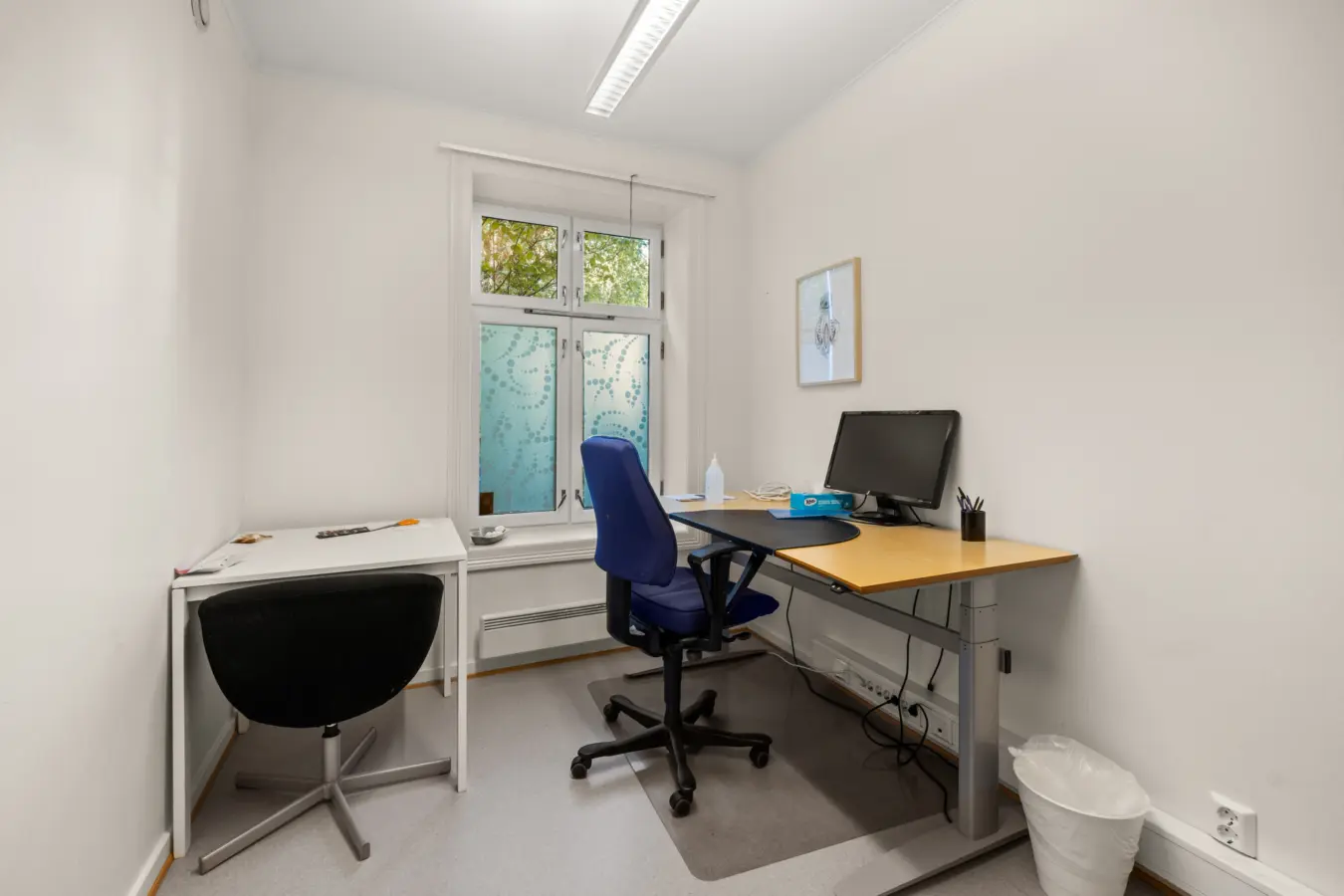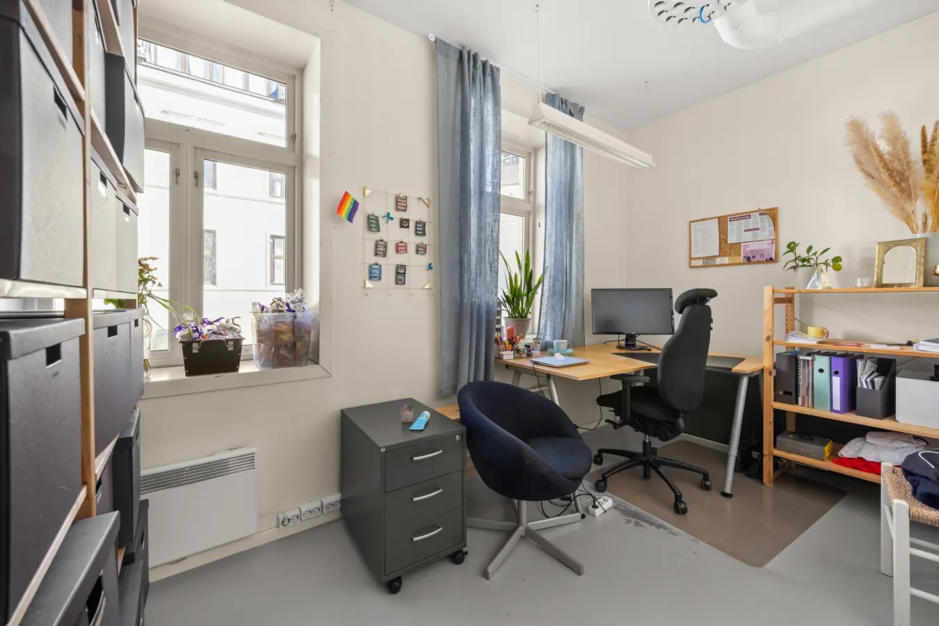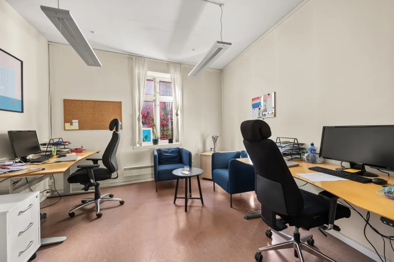 1.etg. Nr. 45: To kontorlokaler, hvor av det ene passer som grupperom eller møterom. Lager, 3 toaletter og dusj. Felles trappegang for begge eiendommene.