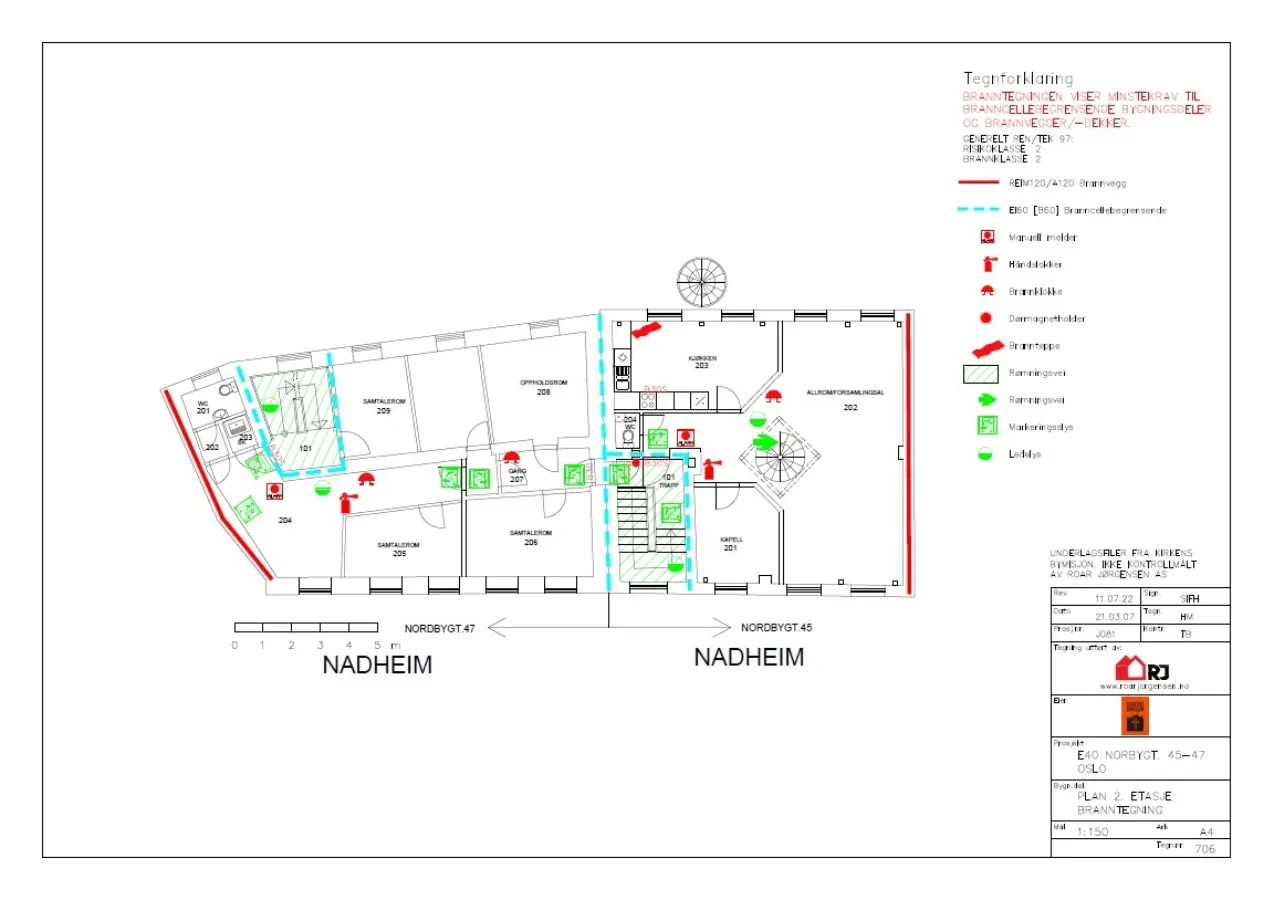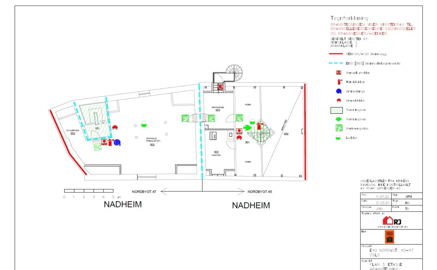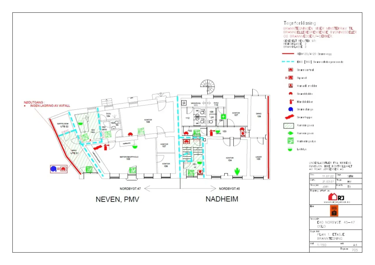 1.etg. Nr. 45: To kontorlokaler, hvor av det ene passer som grupperom eller møterom. Lager, 3 toaletter og dusj. Felles trappegang for begge eiendommene.