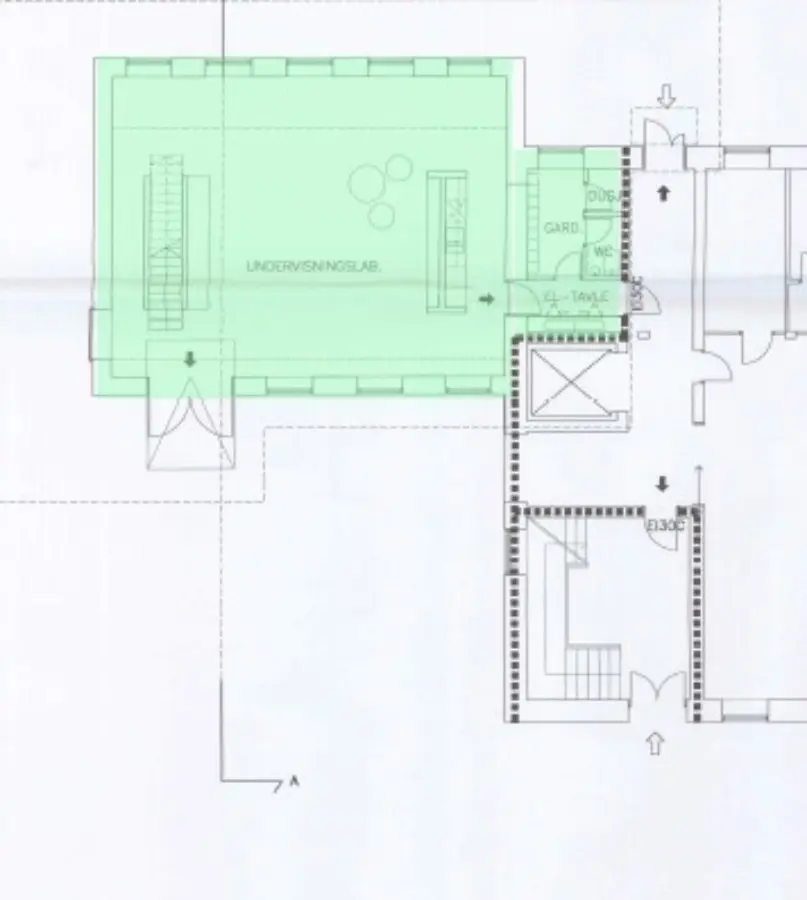2.etg: Kontor/undervisning/showroom og kjøkken. Inngang/garderobe/mottak. Heis.