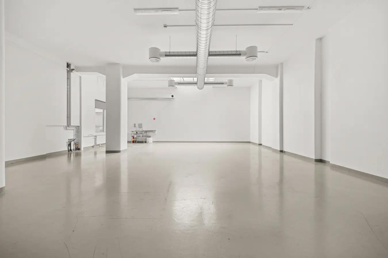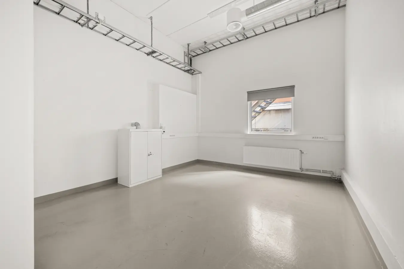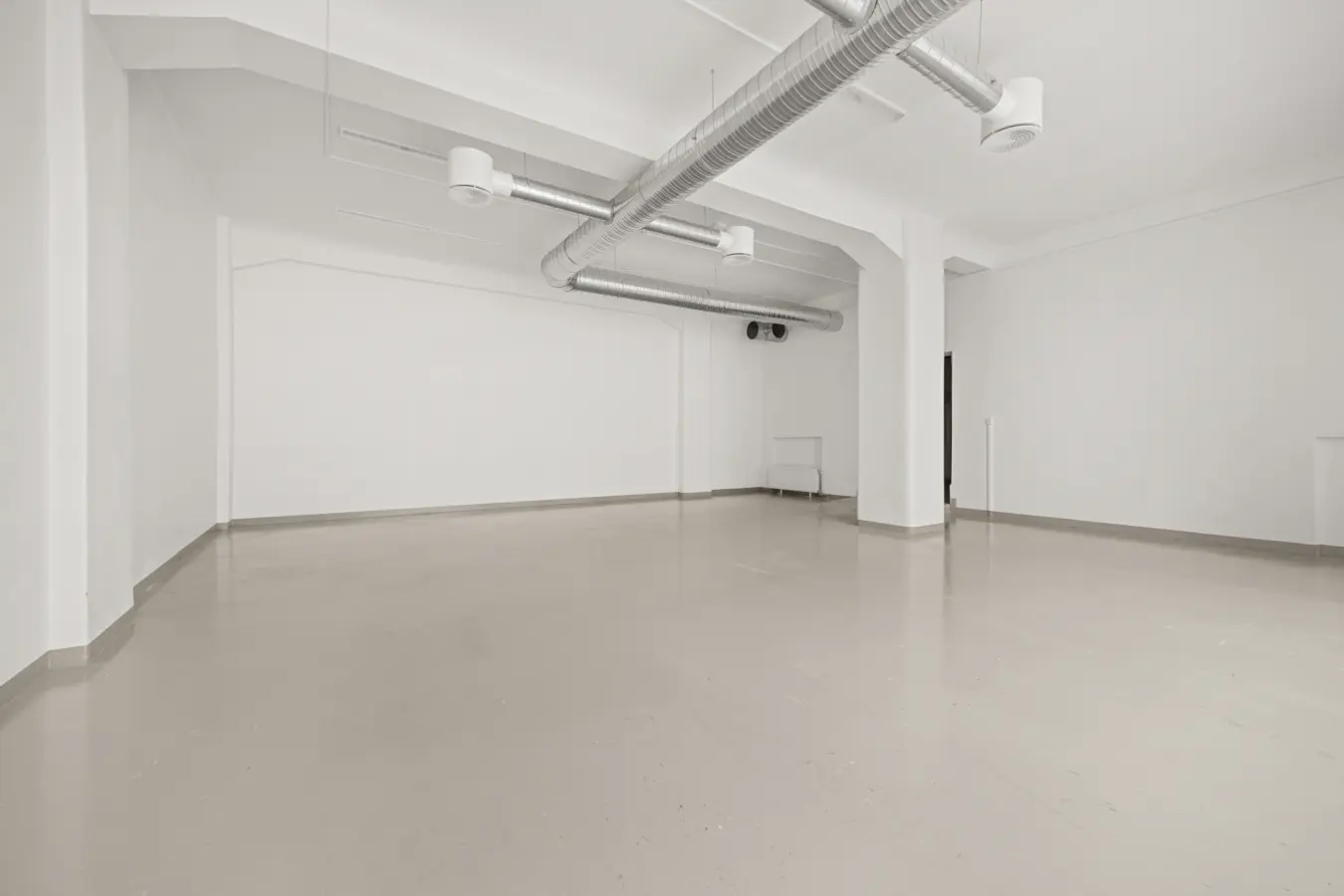 Lyst og luftig lokale med flislagt gulv (epoxy på lager), hvite malte vegger og himling, ventilasjon og god belysning.