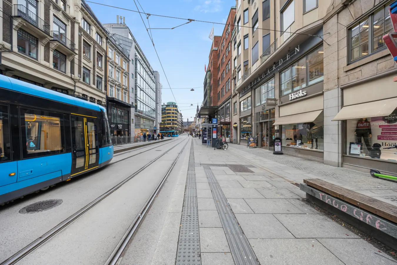 Eiendommen har en meget sentral beliggenhet i Storgata 25 med et yrende liv og trikkeholdeplass rett utenfor lokalet. Denne delen av Storgata har stor fottrafikk og er oppgradert med brede brosteinsbelagte fortau.