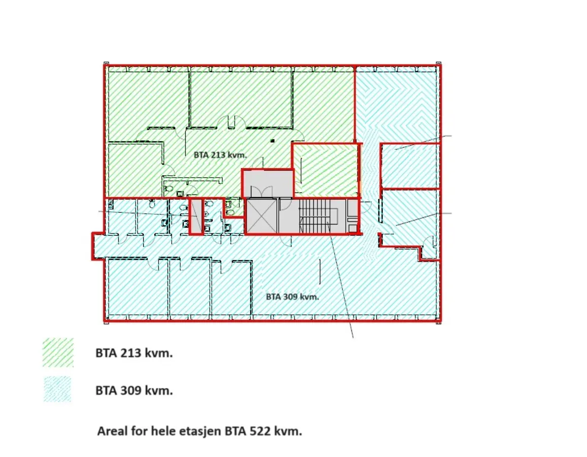 2. etg. Kontorlokale BTA 309 kvm.: Lyse lokaler med god standard bestående av kontorer i varierende størrelse, kontorlandskap, møterom, kjøkken/spiserom og toaletter.