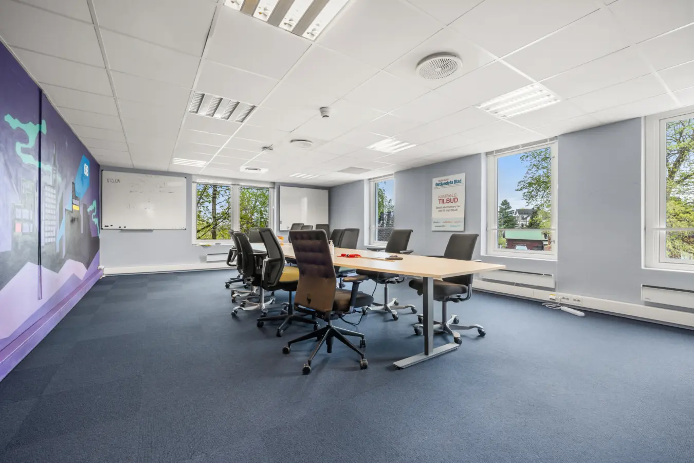 1.etg.: ca. 342 kvm BTA. bestående av 13 kontorer i varierende størrelse, møterom, kurs/konferanserom, kjøkken. Vi kan vurdere oppdeling og utleie av kontorer enkeltvis.