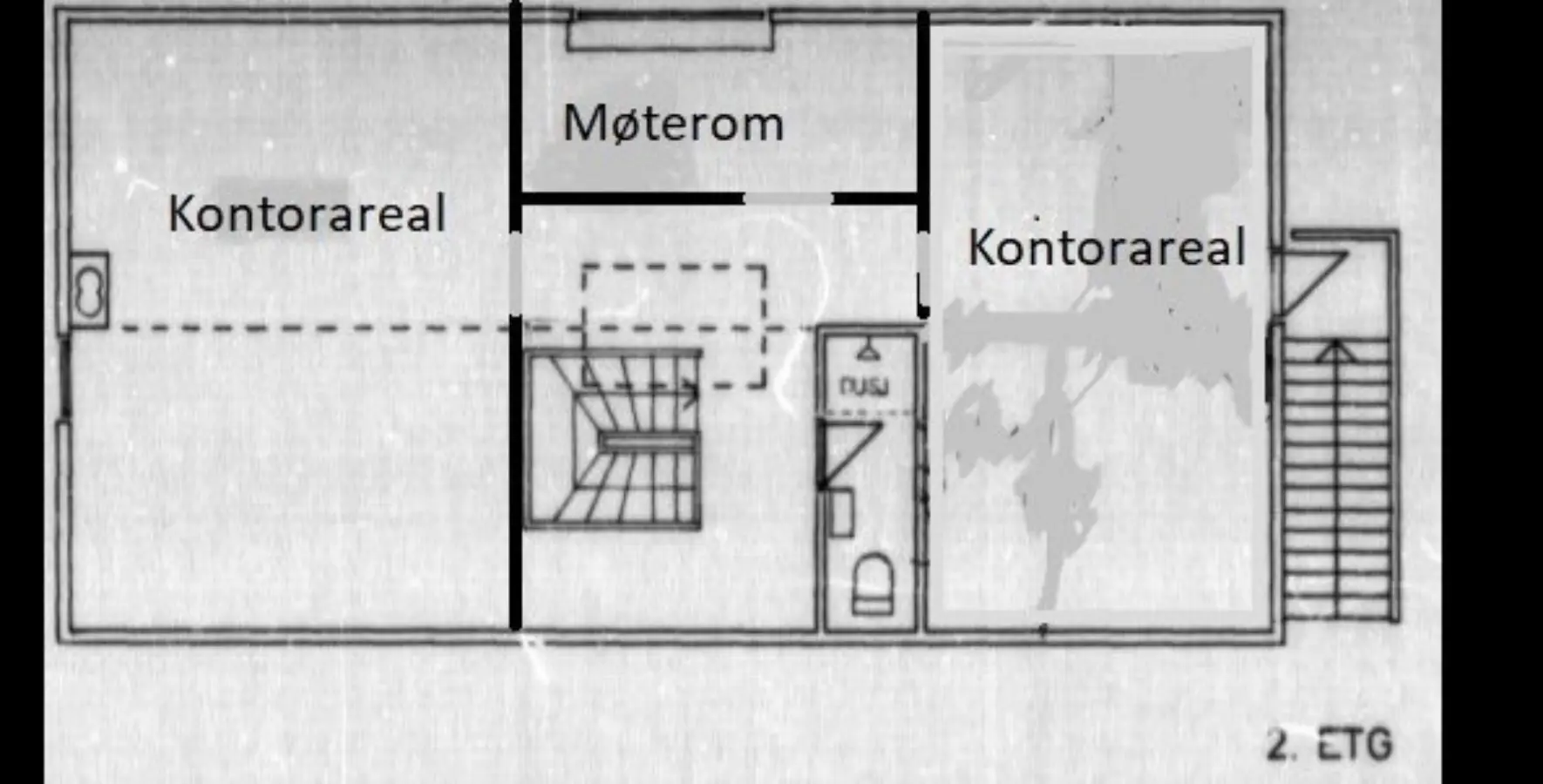 Andre etasje BTA ca. 98 kvm. inneholder kontorer, kjøkken, møterom, kontorlandskap, samt toalettrom med dusj.