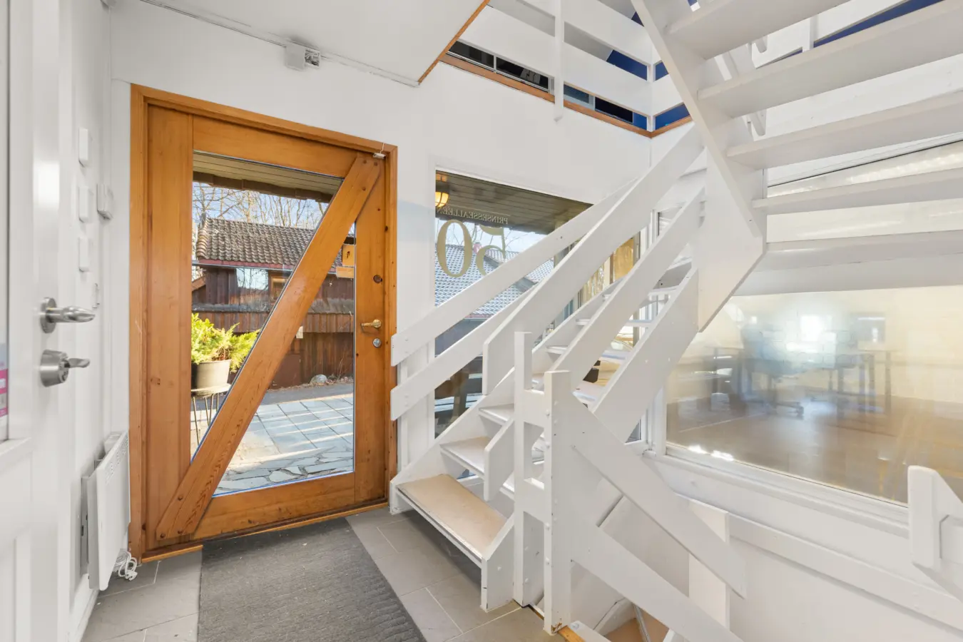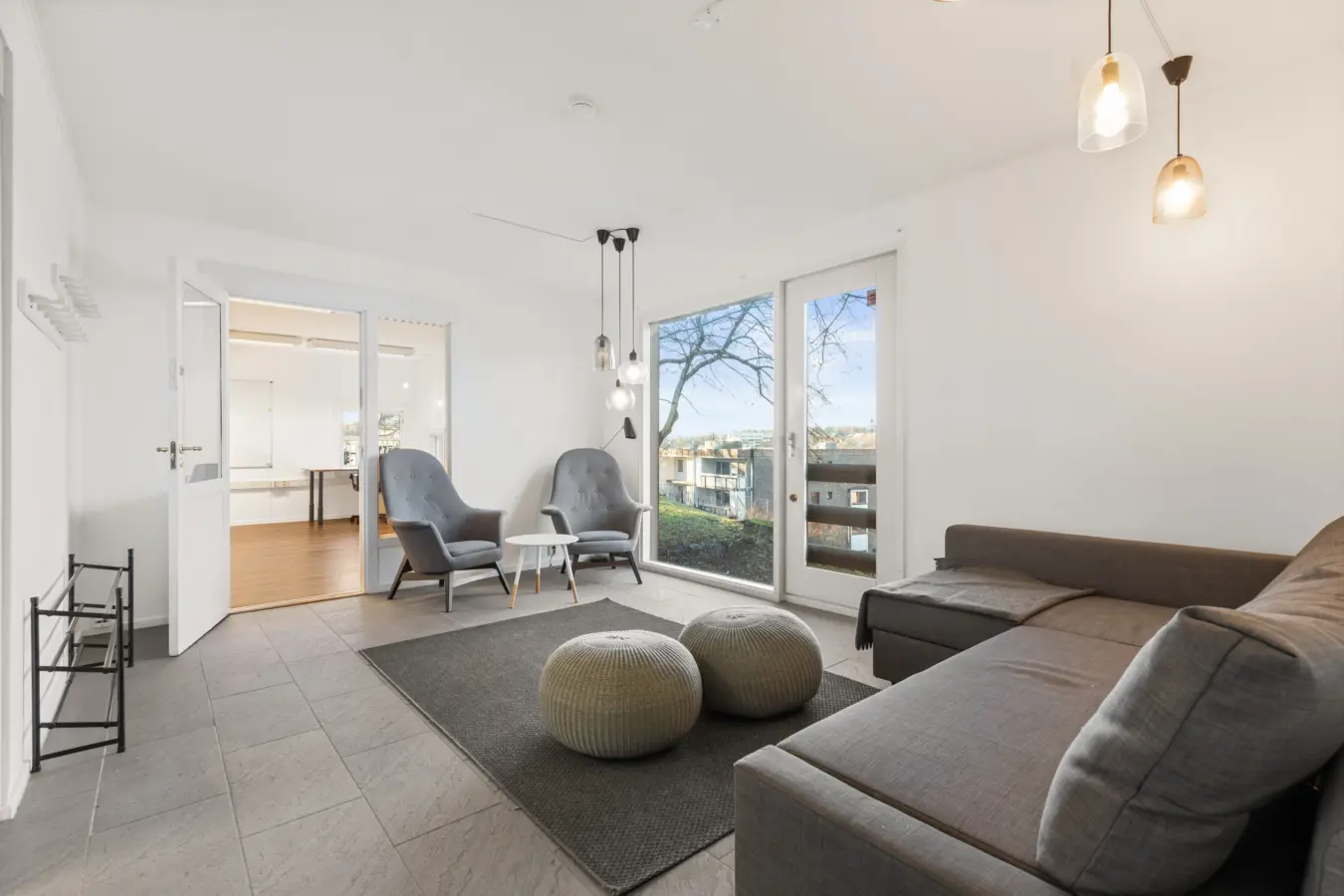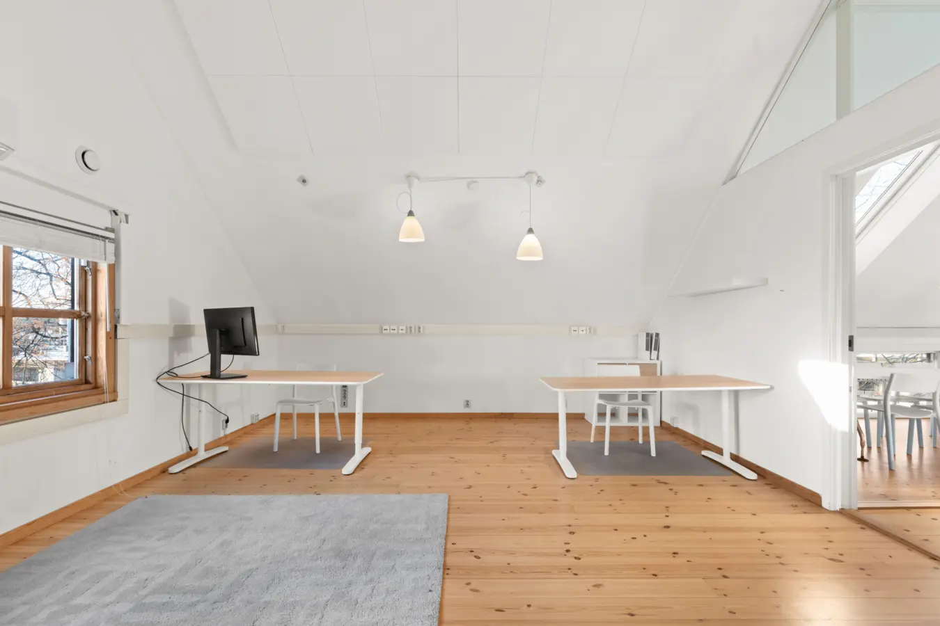 Første etasje BTA ca. 92 kvm. inneholder 2 separate kontorer, sosial sone og showrom/åpent kontorlandskap. (UTLEID)